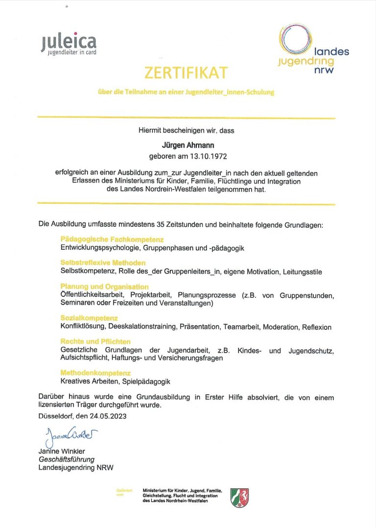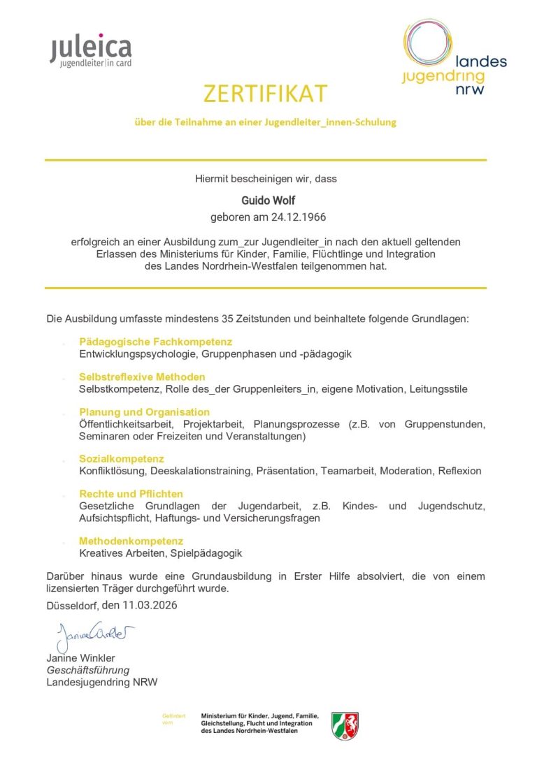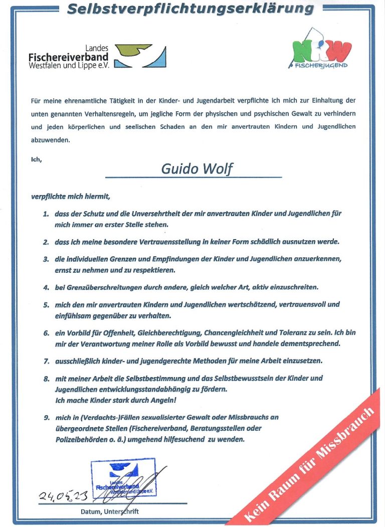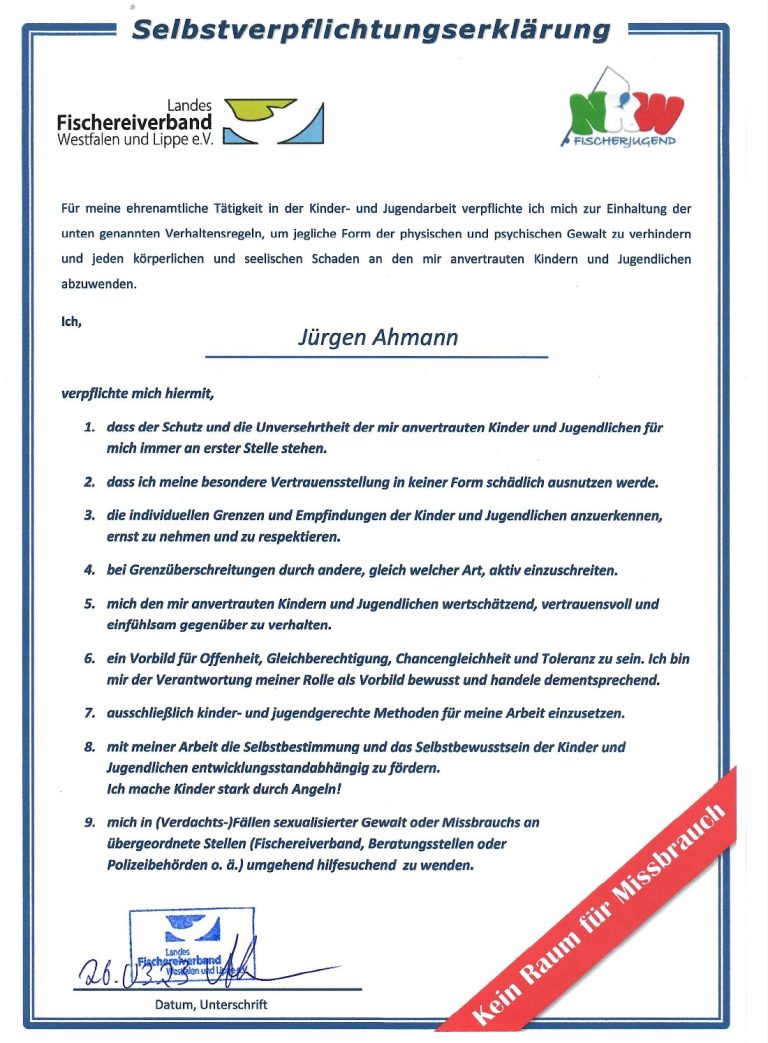 Unser Verein hat darüber hinaus die Empfehlungen zur Überprüfung der Jugendwart